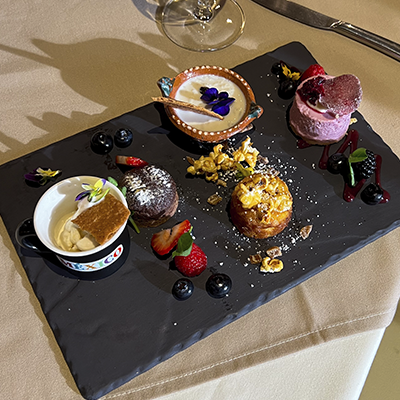 Servido con helado de queso, acompañado de palomitas de caramelo, elote cristalizado, amaranto y teja de canela.
