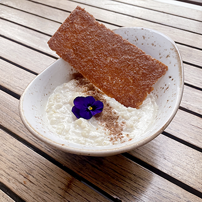 Receta de Los Girasoles acompañado de una teja de cocoa.
