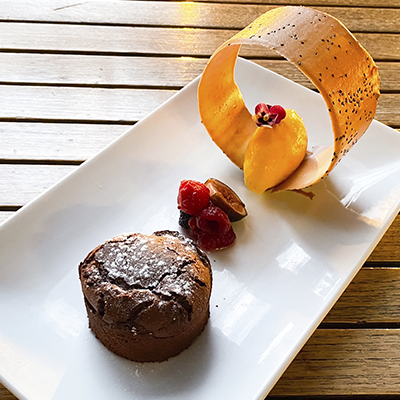 Volcán de chocolate y mole poblano acompañado de una teja de chía y helado de plátano.