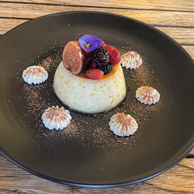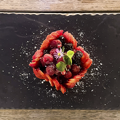 Decorado con pétalos de rosa cristalizados, mermelada de rosas y coulis de frutos rojos.