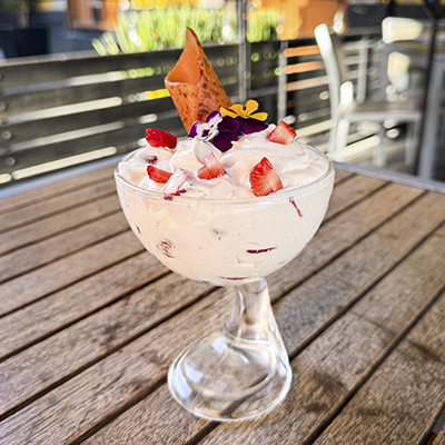 Con frutos rojos, crema batida y chocolate semi amargo.